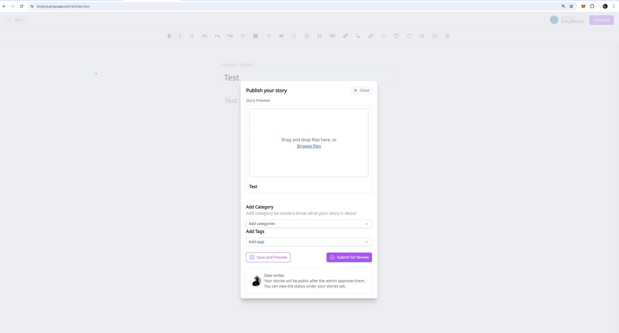 a. Save and Preview: This option will save your article and let you preview it, as to how it will look after posting it. Recommended to the Creator that he choose this option and review his work/or save it to continue writing later. This will put the article in Draft state.