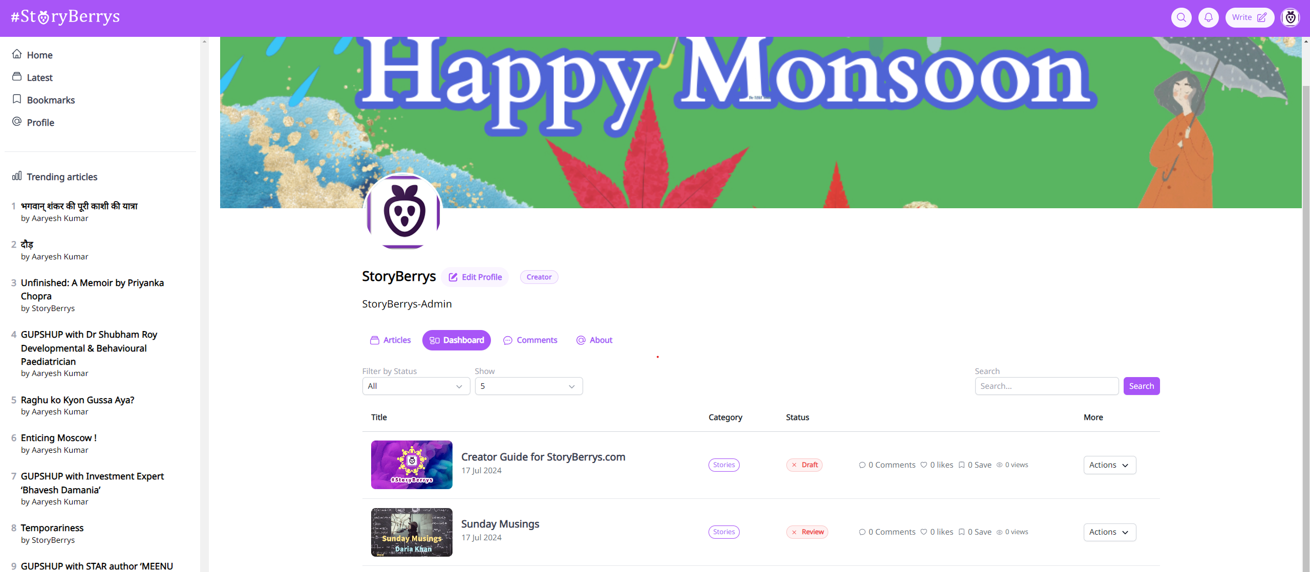 The editor has various options that you can use to write, it includes writing options of a normal Word like bold, underline, centering, title headers, break line etc., and also allows users to post YouTube videos, Spotify links, Images, and other normal Hyperlinks. You can save the article As draft for later writing and this draft will be accessible through your dashboard, in filter just select draft/review/published to see your various articles.