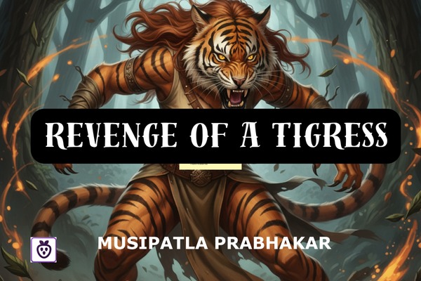The girl looked at PS furiously, her eyes widening and reddening, her hair standing straight up on her head, her face and body transforming into that of a tigress, with its upper teeth protruding on the sides. PS was shivering with fear and dumbstruck by the sight of the tigress. The tigress then growled at him and swiftly jumped on PS, and he fell to the ground. The tigress sat on his chest, thumped on his heart and lungs, and split his neck and drank his blood. He was dead. It stood on its two back legs and roared about its achievement. By then, the thunderstorm and the downpour had subsided. With the roaring sound, the followers emerged from below the jeep and searched for PS and the girl. By then, the tigress's soul vanished into the air. They found PS dead with all his blood removed, muscles gone, only bones covered with skin left under the tree, with his neck split and his blood all around.