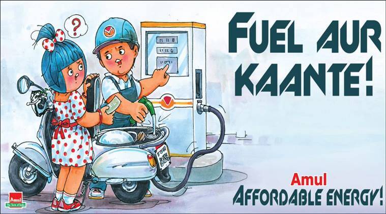 The recent ‘Fuel aur Kaante’ cartoon published by Amul, uses superb sarcasm using words and the expression of Amul girl, commenting on the prickly price of the petrol and diesel at the moment. It also shows the Amul girl baffled and in a state of shock, as she hands over a currency bill.